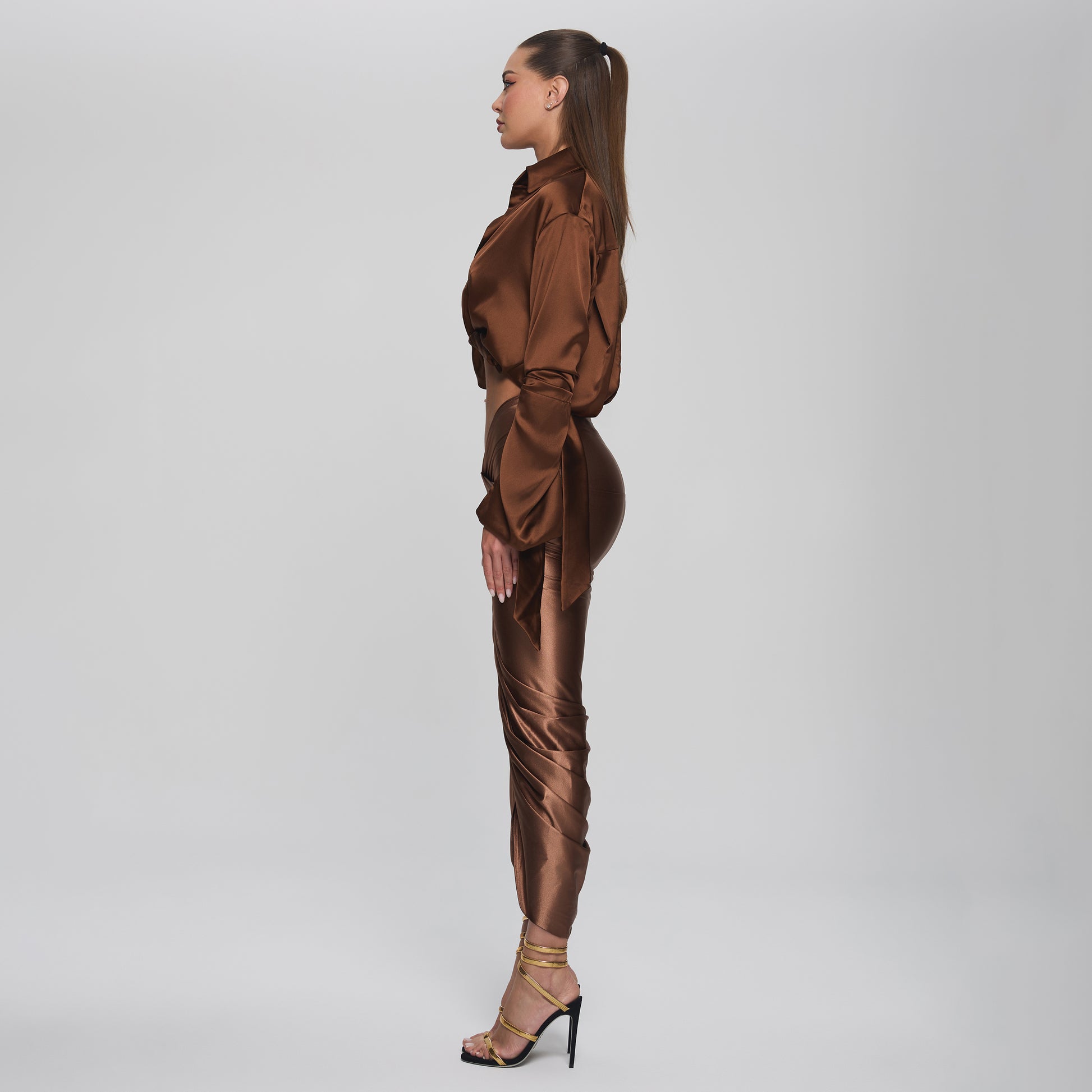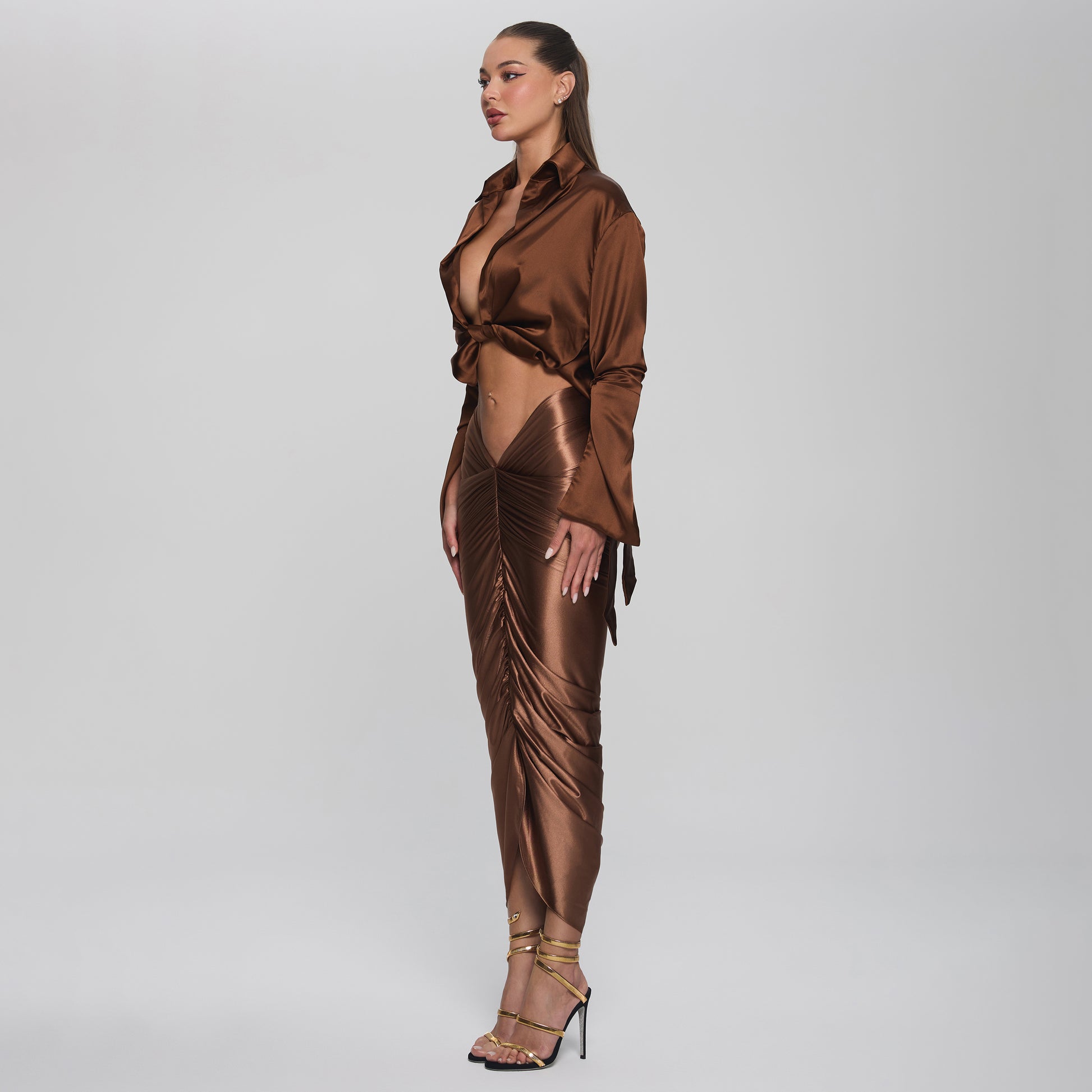 A figure-enhancing satin maxi skirt with a sculpting V-waistline, detailed front ruching, pocket detail and a subtle front slit for movement.