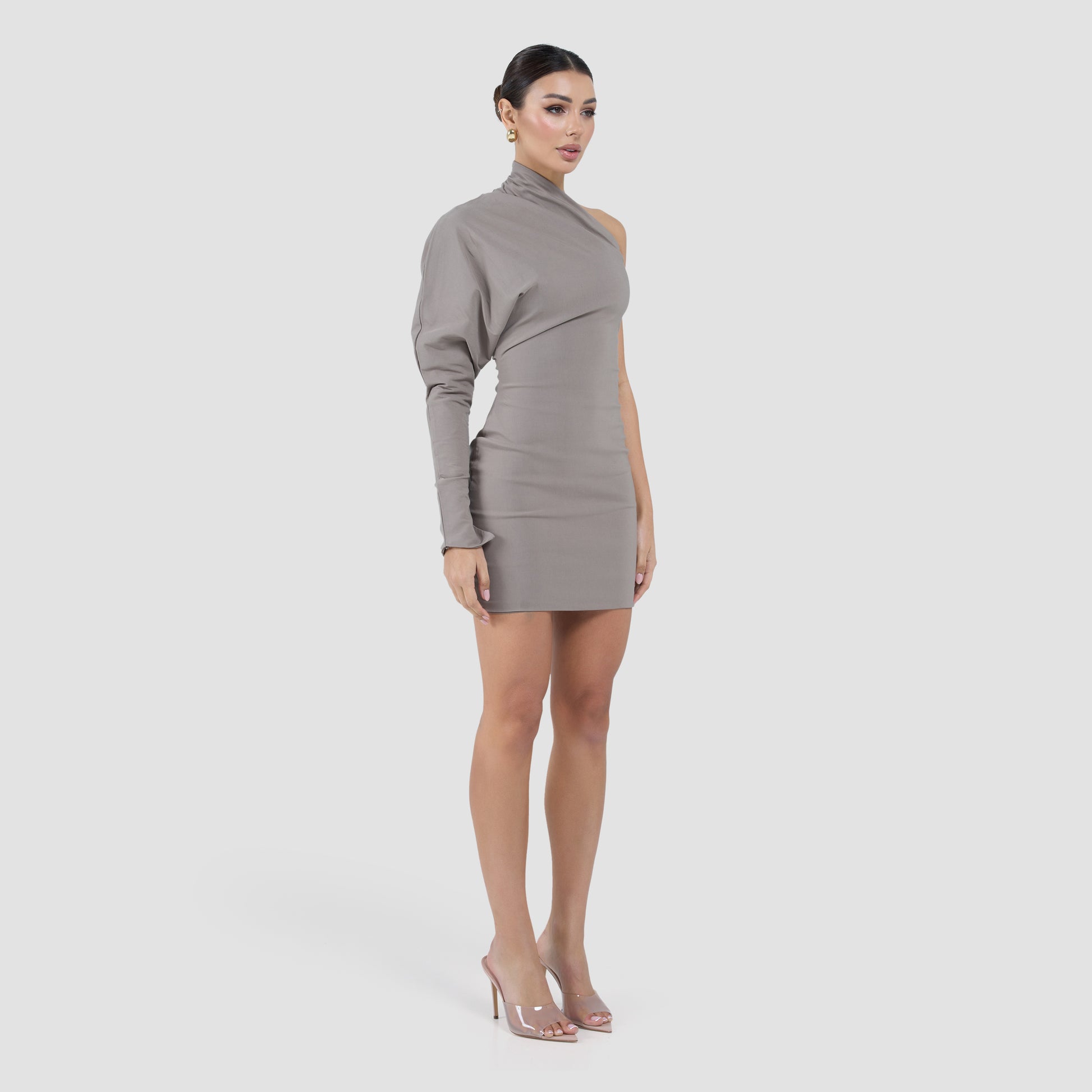 An asymmetric one shoulder mini dress in Taupe. Doubled lined to cinch any figure. Crafted in our firm and buttery textile to offer structure, support and longevity whilst still being a comfortable wear.