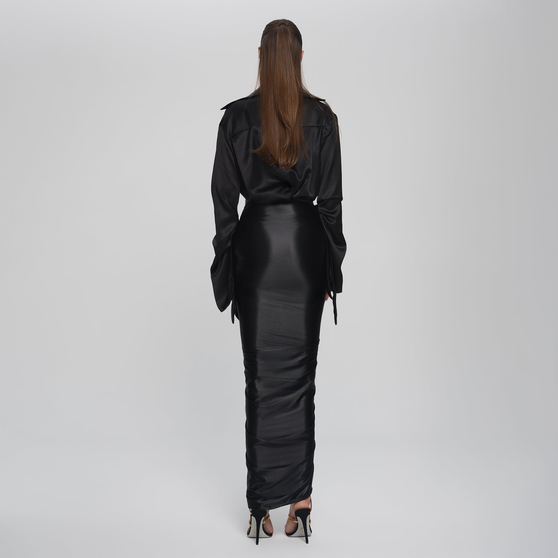 A sleek silk crop blouse featuring a deep plunge twist neckline, draped long sleeves with an an adjustable tie on the back and cuffs for a flattering, feminine fit.