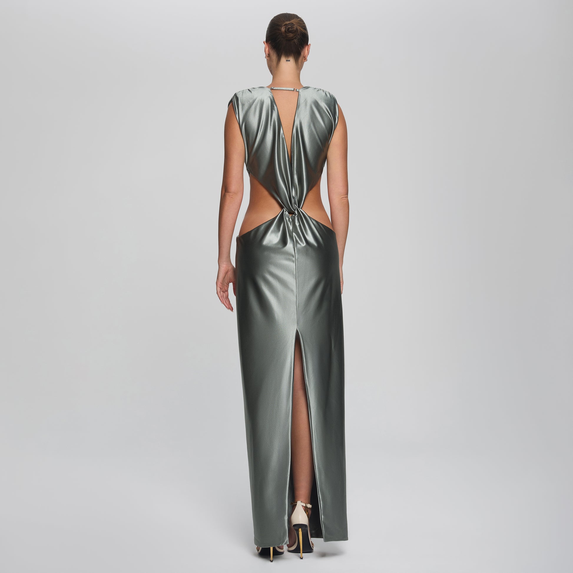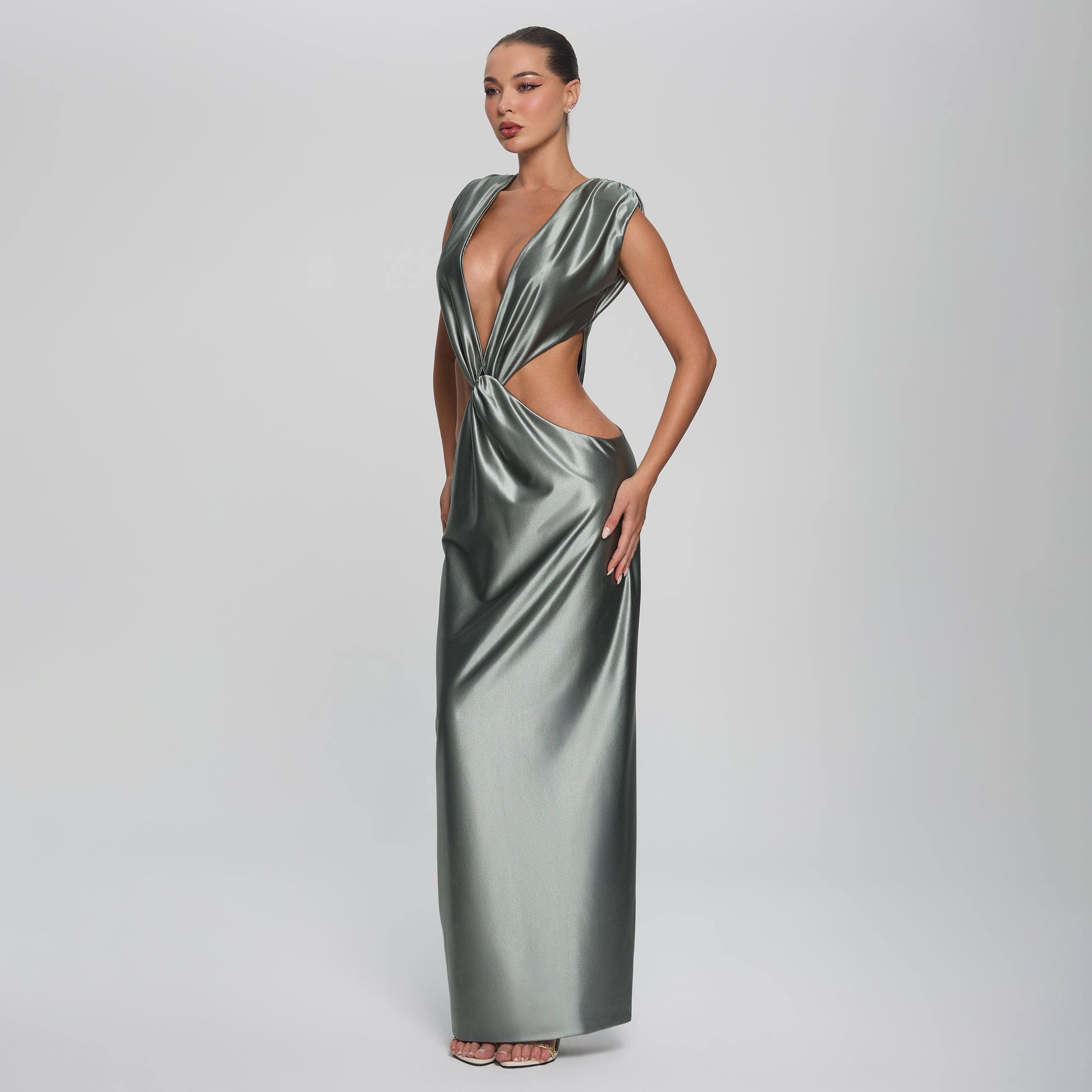 Our signature satin maxi dress featuring a deep plunge neckline, sculpted front knot detail and bold side cut-outs that highlight the waist. Finished with an open back and sleek column silhouette for an statement look